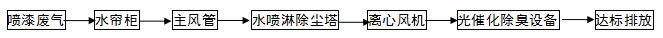 二、噴漆廢氣處理設備(水噴淋除塵塔+光催化除臭設備)處理工藝說明: